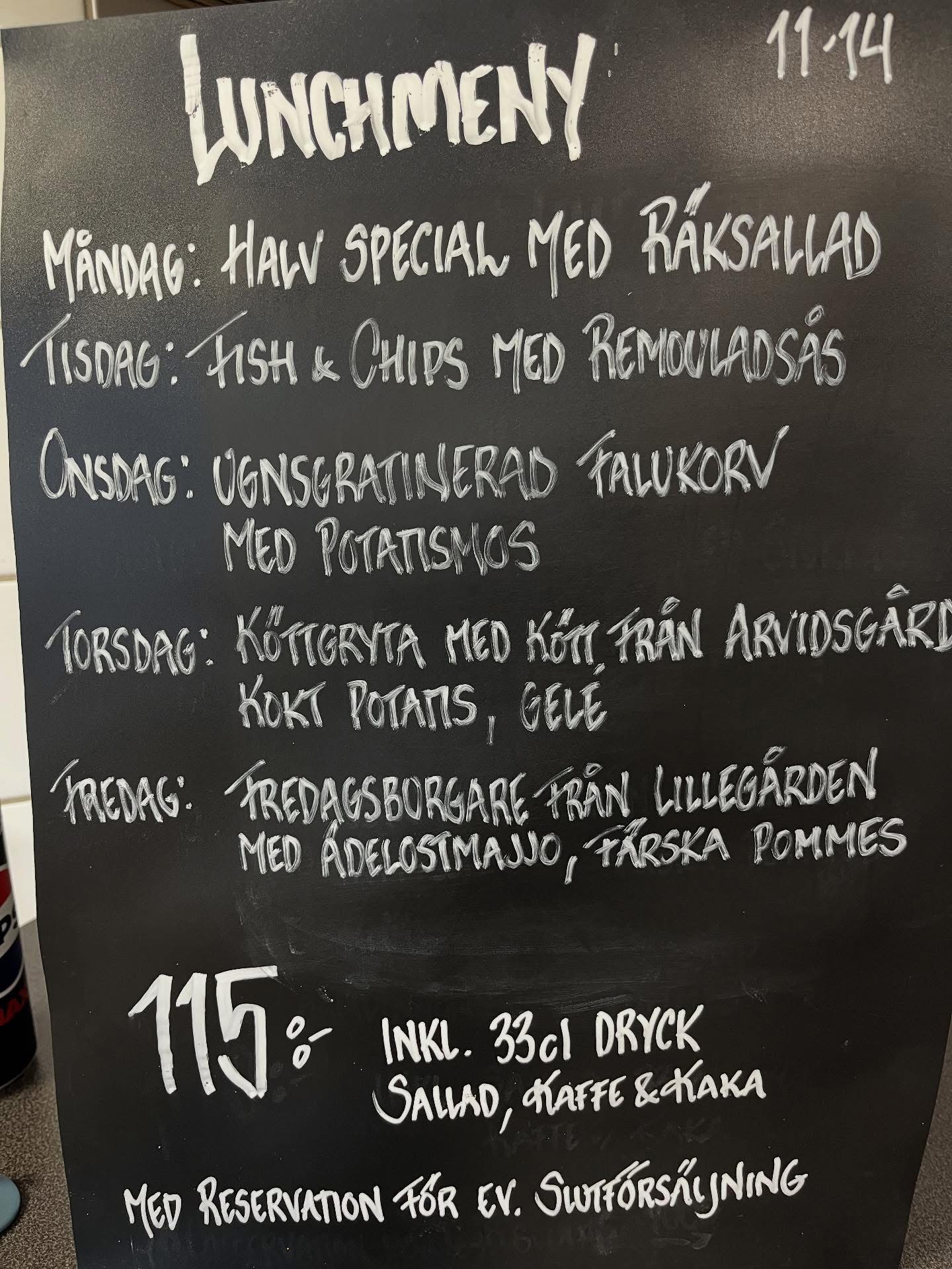 Måndag till fredag mellan 11:00 - 14:00 erbjuder vi varierad husmanskost som dagens för endast 115:- inkl dryck, sallad, kaffe & kaka.