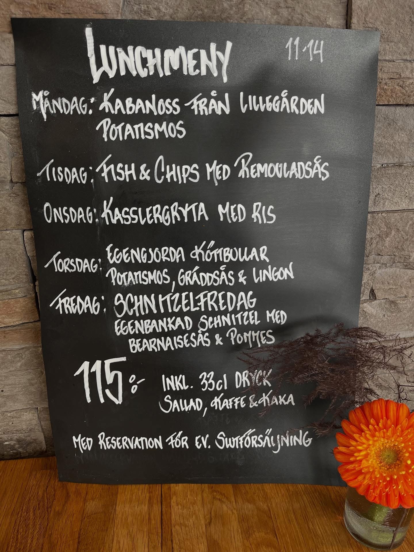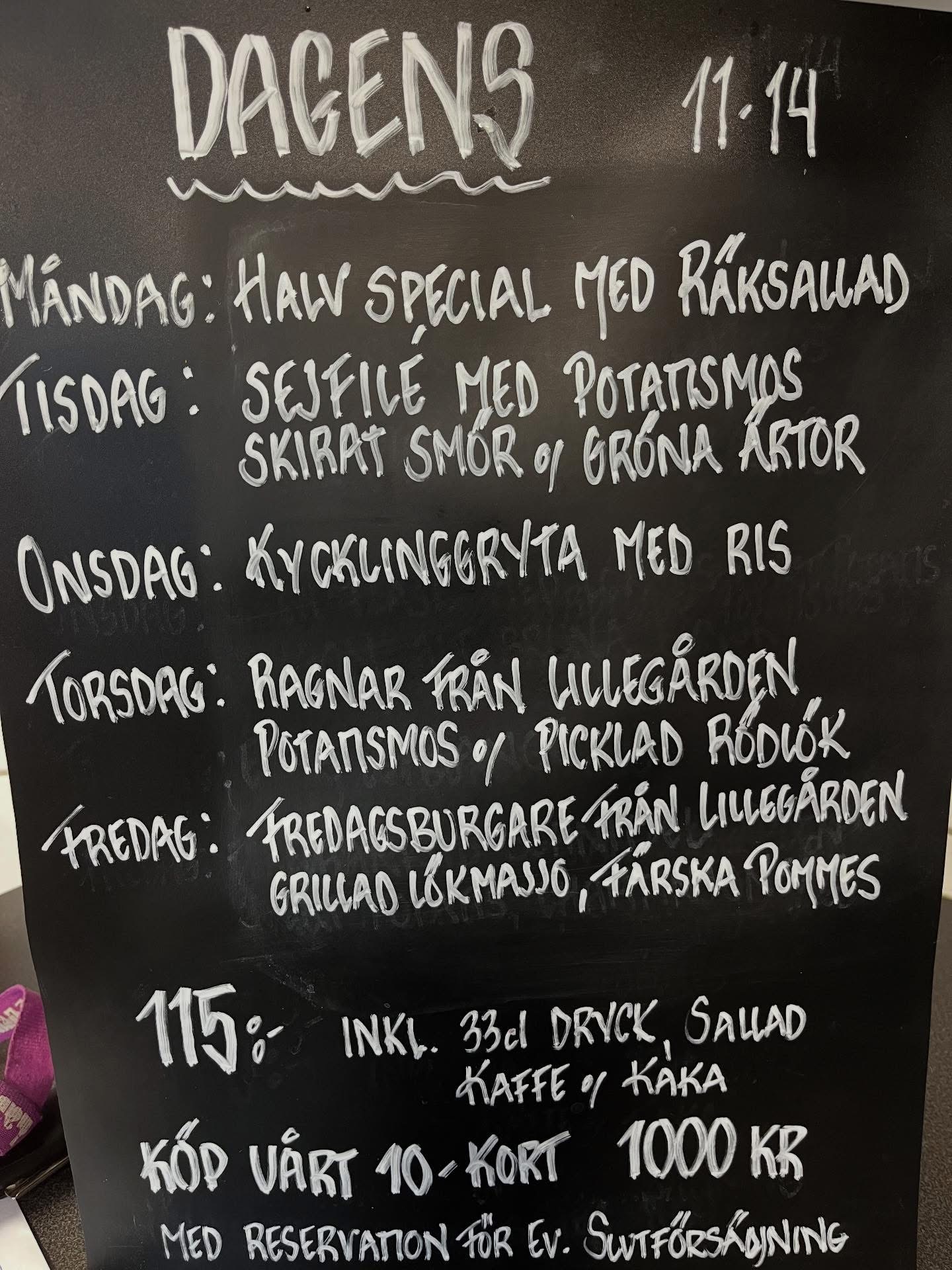 Måndag till fredag mellan 11:00 - 14:00 erbjuder vi varierad husmanskost som dagens för endast 115:- inkl dryck, sallad, kaffe & kaka.