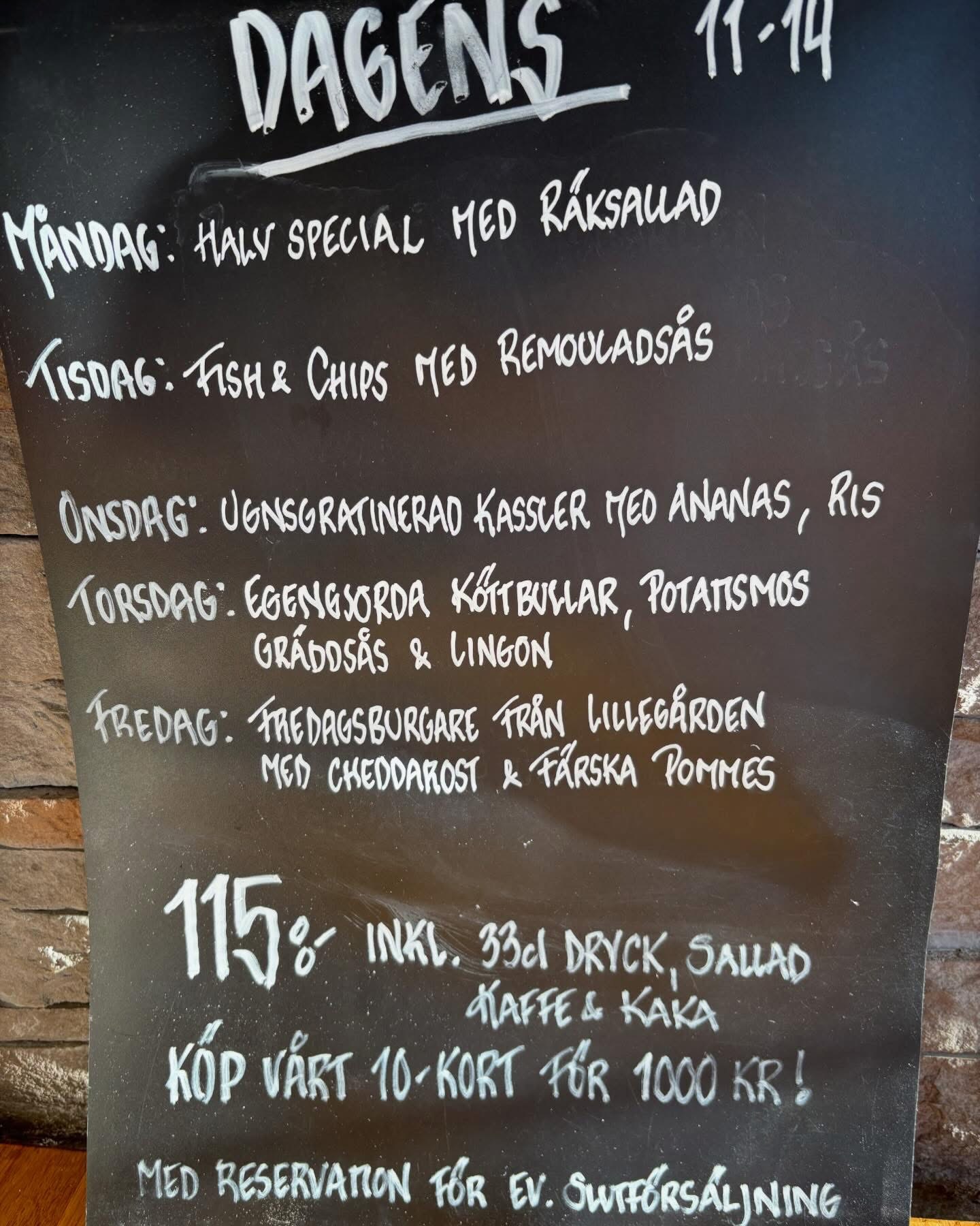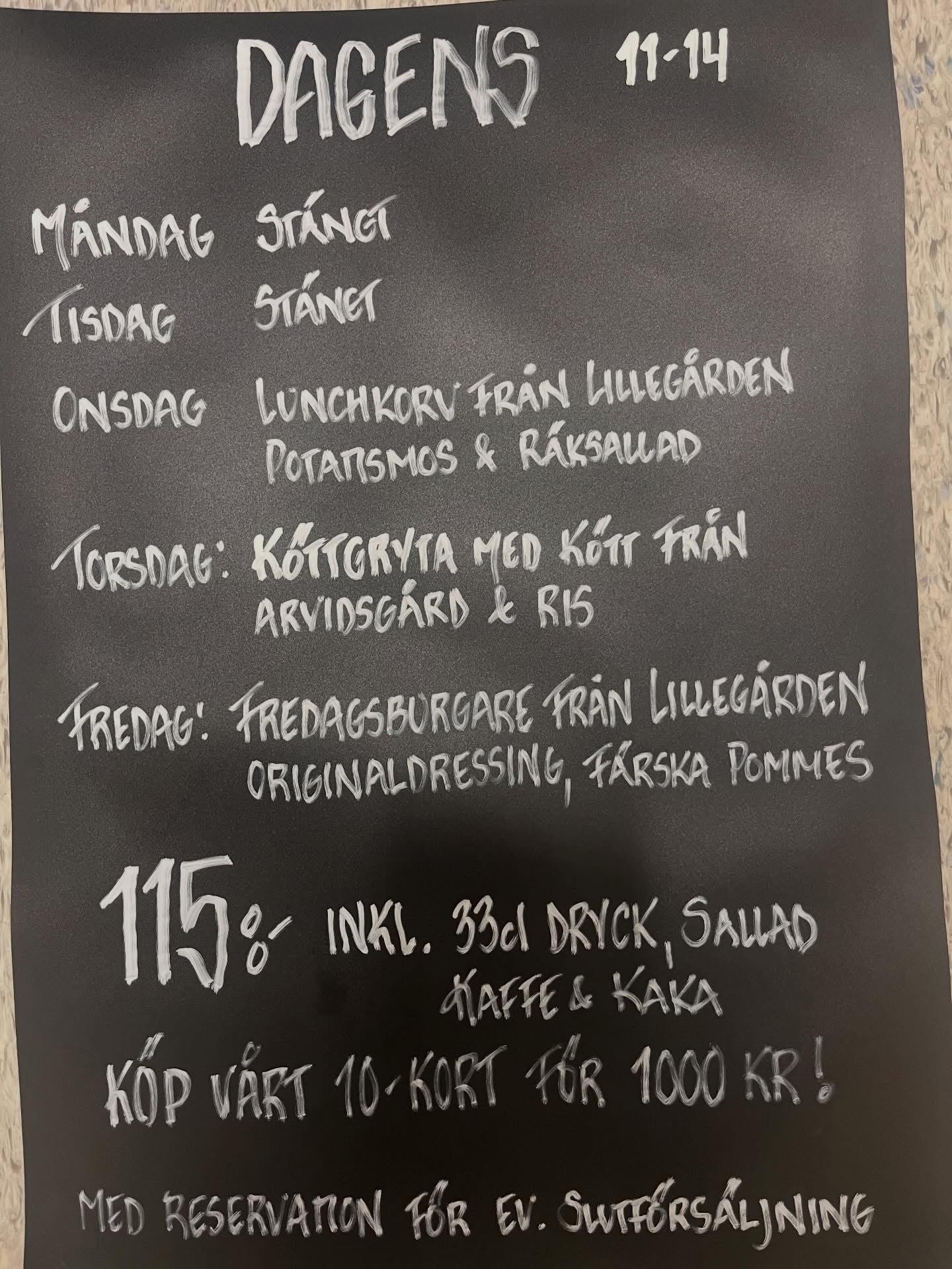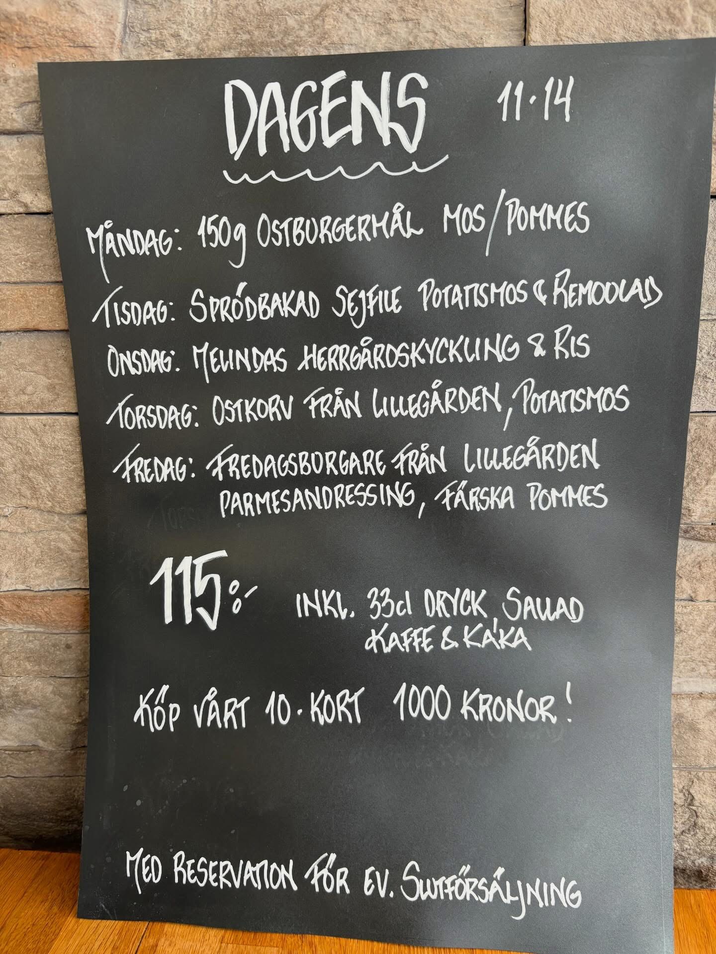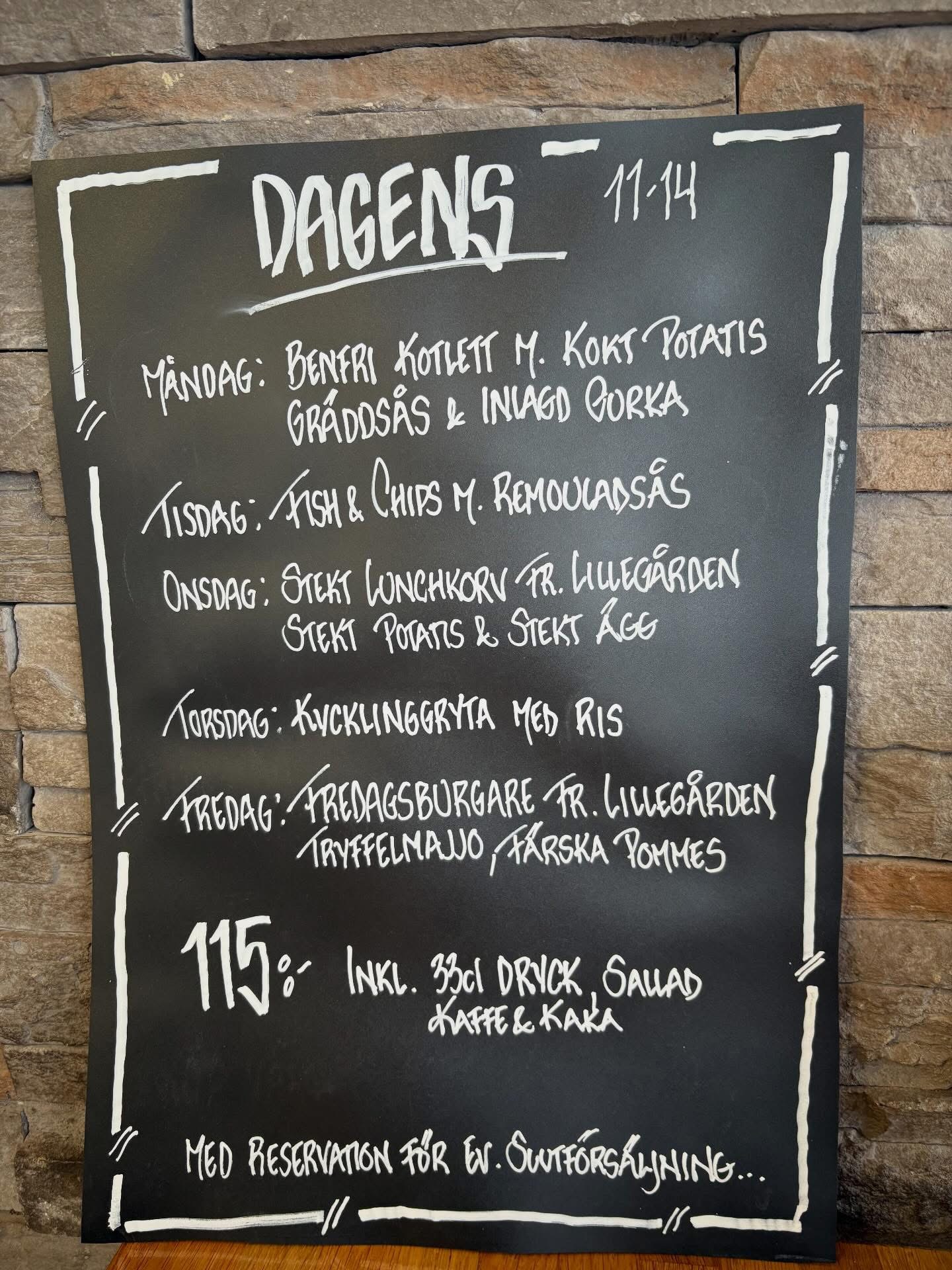 Måndag till fredag mellan 11:00 - 14:00 erbjuder vi varierad husmanskost som dagens för endast 115:- inkl dryck, sallad, kaffe & kaka.